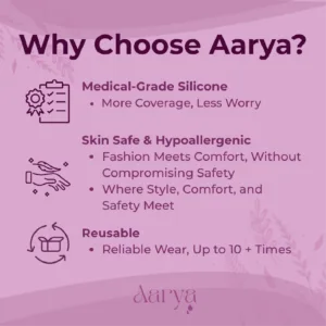 Ultra Slim & Discreet- AARYA Nipple Covers, reusable for women, are crafted from premium silicone, offering a slim and discreet fit that disappears under any outfit. Whether you’re wearing a sheer blouse, a light summer dress, or a daring backless gown, these silicone nipple pads ensure a smooth, invisible finish, letting you step out with confidence.